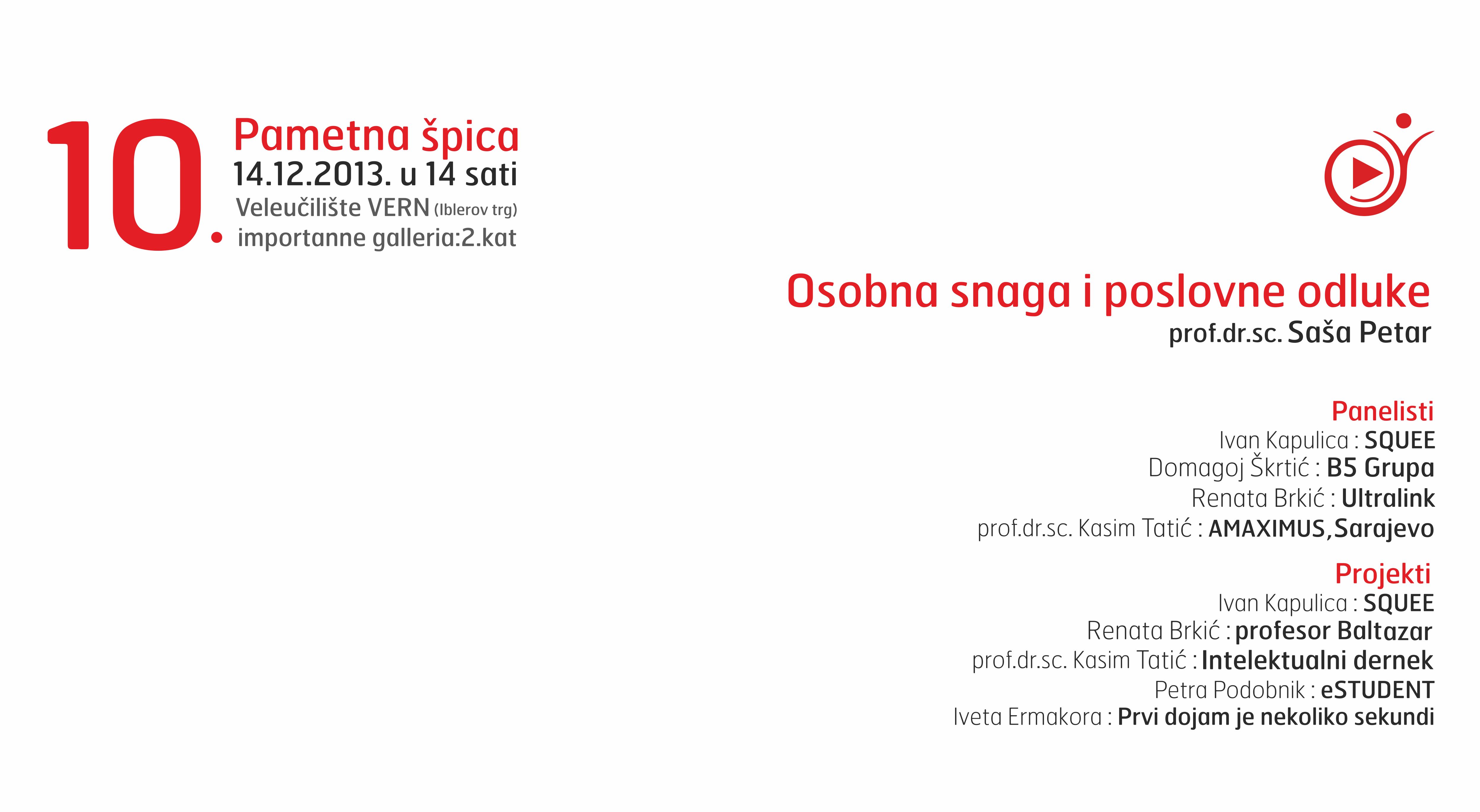 Na jubilarnoj 10. Pametnoj špici, tema je ˝Osobna snaga i poslovne odluke˝, a raspored je slijedeći: