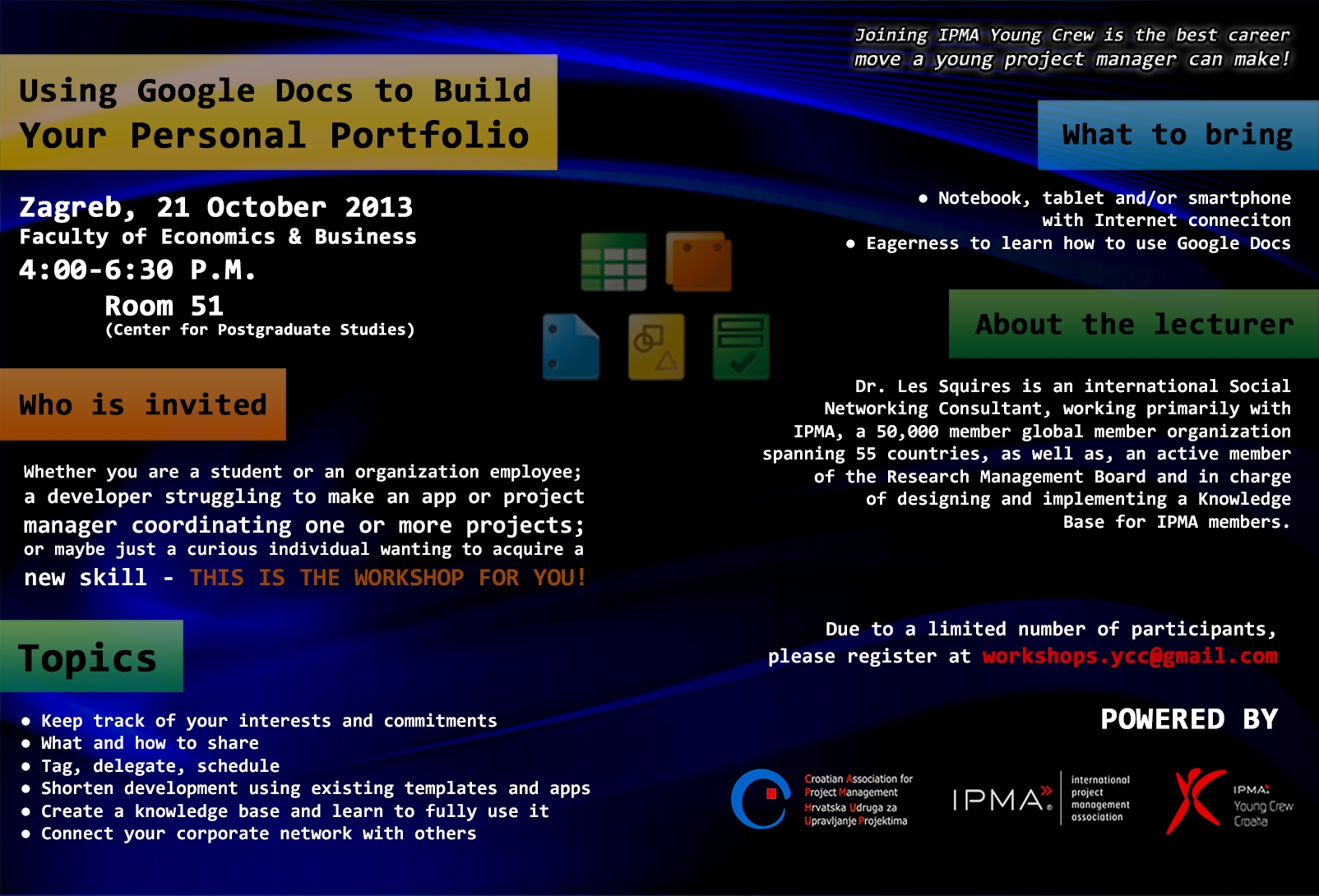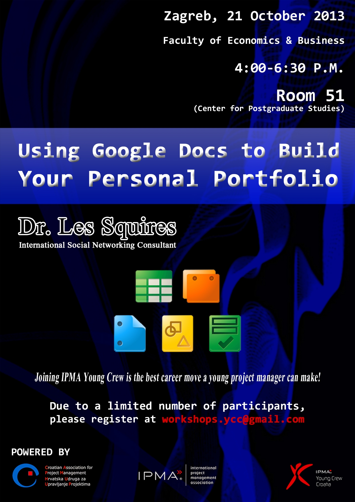 Pozivamo Vas na radionicu u organizaciji Hrvatske udruge za upravljanje projektima (HUUP) i Young Crew Croatia (YCC) koju će održati dr. Les Squires (International Social Networking Consultant) na temu “How to use Google Docs to Build Your Personal Portfolio”.